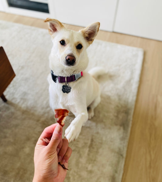 Dogs thrive on an unprocessed, varied whole prey diet, and a big part of a dog’s life is working for those treats! Our treats are dehydrated from raw after receiving a proprietary bath of apple cider vinegar (ACV) and a blend of herbs, which acts as a natural, antimicrobial preservative. Each type of protein is hand-cut to ensure that it’s just that: clean, lean single protein, minus filler fat and gristle. Whether you use them for training, or as meal toppers/supplements, or dental chews, our dehydrated treats are a perfect complement to any dog’s diet.